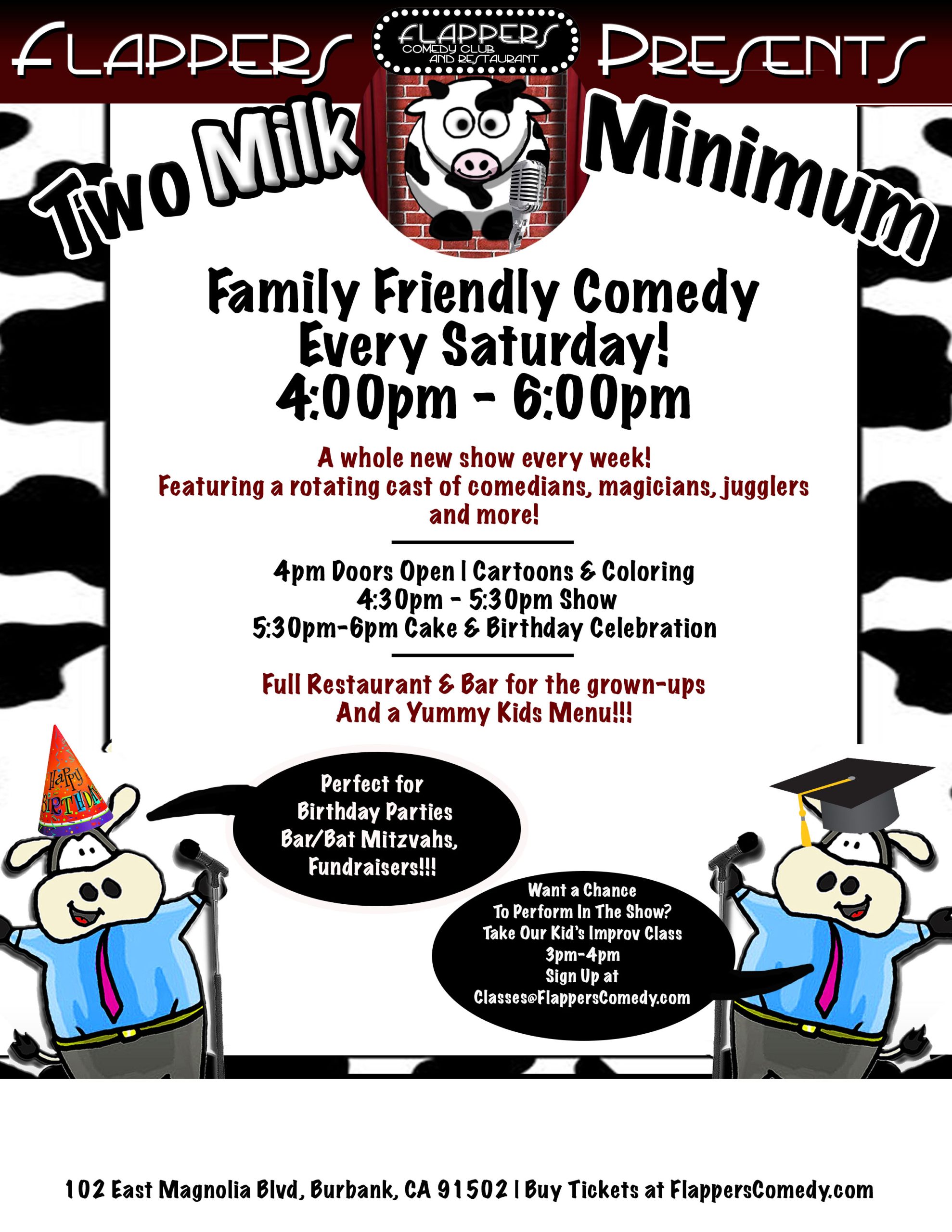 Two Milk Minimum is the funniest way to spend your Weekend! Grab your kids and come on down for this amazing Family Friendly Comedy Show. We have a full menu for grown ups and a Super Cool Kids Menu with Burgers, Fries, Mac and Cheese and pizza. CHILDREN UNDER TWO YEARS GET IN FREE.